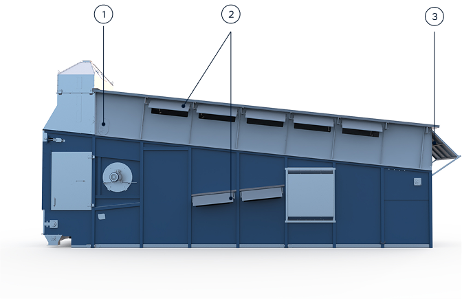 Зерно перемещается по ложу из нержавеющей стали с помощью экранов, которые толкают его. На сушилке установлены две горелки (дизельные или газовые), которые создают горячий воздух. Этот воздух подается в камеру сушки через авиационную заслонку (вентилятор).