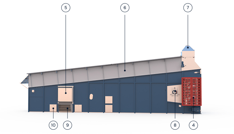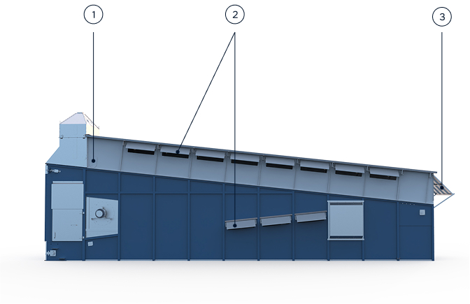 Зерно перемещается по ложу из нержавеющей стали с помощью экранов, которые толкают его. На сушилке установлены две горелки (дизельные или газовые), которые создают горячий воздух. Этот воздух подается в камеру сушки через авиационную заслонку (вентилятор).