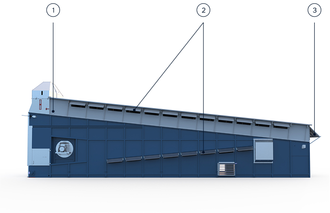 Зерно перемещается по ложу из нержавеющей стали с помощью экранов, которые толкают его. На сушилке установлены две горелки (дизельные или газовые), которые создают горячий воздух. Этот воздух подается в камеру сушки через авиационную заслонку (вентилятор).