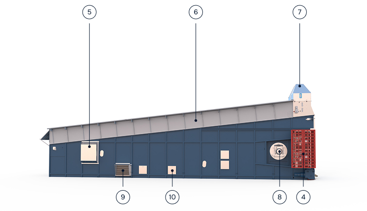 Процесс сушки полностью автоматизирован. Оператор контролирует весь технологический процесс на экране пульта управления, включая скорость перемещения, работу вентиляторов, температуру сушки и высоту перемещаемого зерна.