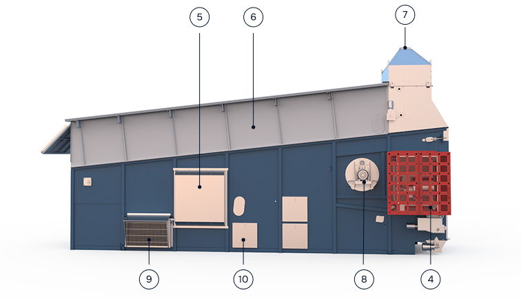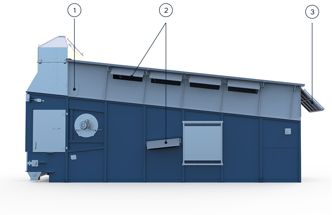 В задней части устройства расположен большой люк с торца. При открытии крышки через него выходит тёплый воздух и мелкий летучий мусор. Когда происходит охлаждение, мусор остаётся внутри, а поток тёплого воздуха направляется в горячую камеру и затем в камеру сушки. Это позволяет значительно снизить расходы на нагрев воздуха.